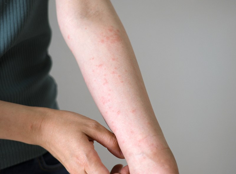 皮膚科を受診される患者様に、とても多く見られる症状です。ブツブツや小さな水ぶくれ、赤みなどが混ざって現れ、痒みも伴います。様々な原因で起こりますが、自己免疫や食物アレルギー、ダニ、ハウスダスト、薬疹などが代表的です。湿疹は痒みを伴うことが多いため、ついつい掻いてしまいがちですが、患部を掻き壊してしまうと病状が一層悪化するので注意してください。